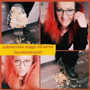 Als persönliches Eigentum betrachtet dich deine Herrin und hält dich mit Erniedrigungen auf dem Boden. Hier bekommst du auch dein Essen zubereitet. Deine Nahrung crusht die Herrin mit ihren Stiefeln, bis alles matschig ist und nur noch von dir aufgeleckt werden muss. Die Stiefel und der Boden sind schmutzig, aber du wirst alles fressen. Bei dem Crushing darfst du zuschauen, denn damit sorgt deine Herrin für einen geilen Brainfuck. Gnadenlos zerstört sie dein Essen und deinen Willen, denn sie hat die Macht.